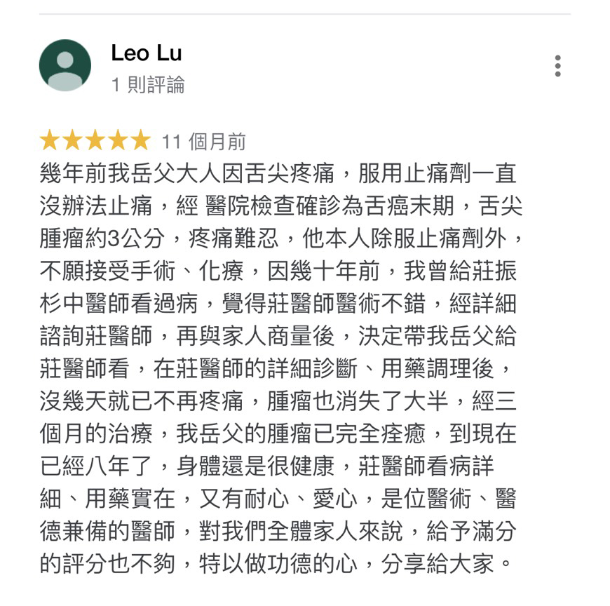 初診 求診時66歲,右舌尖腫瘤約3cm、經某大醫院確診為舌癌晚期,求診時未經中西醫任何治療,因疼痛已服二個月止痛劑,本院以中醫藥直接治療且快速痊癒的成功案例。
