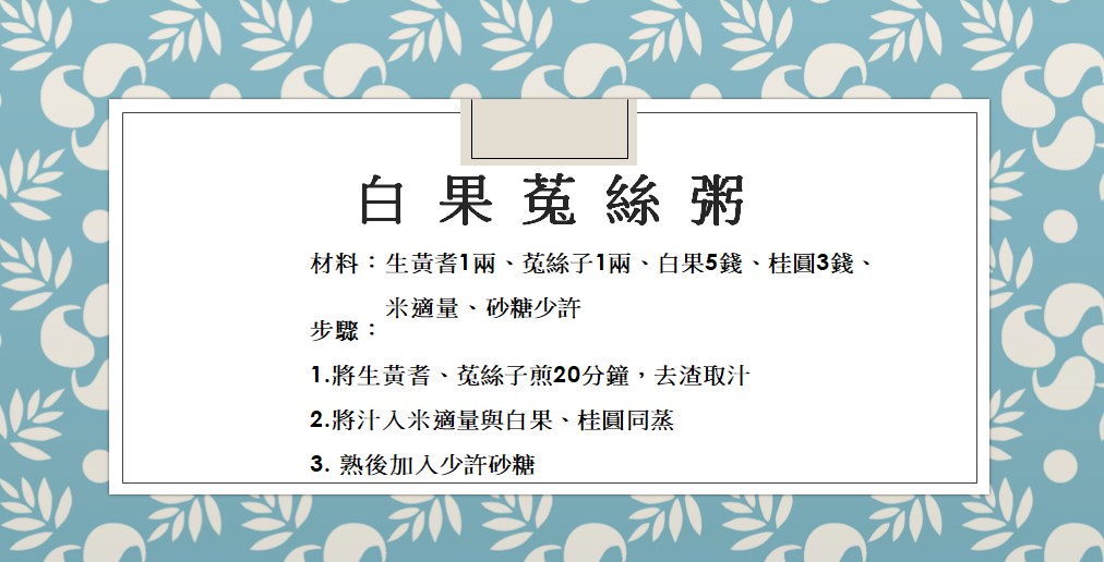 2025 年 9 月 19 日 早洩原因 早洩, 早洩食療, 白果菟絲粥, 食療, 中醫食療 早洩食療參考 白果菟絲粥 材料:生黃耆1兩、菟絲子1兩、白果5錢、桂圓3錢、米適量、砂糖少許 步驟: 1. 將生黃耆、菟絲子煎20分鐘,去渣取汁 2. 將汁入米適量與白果、桂圓同蒸 3. 熟後加入少許砂糖 By ching 0 0