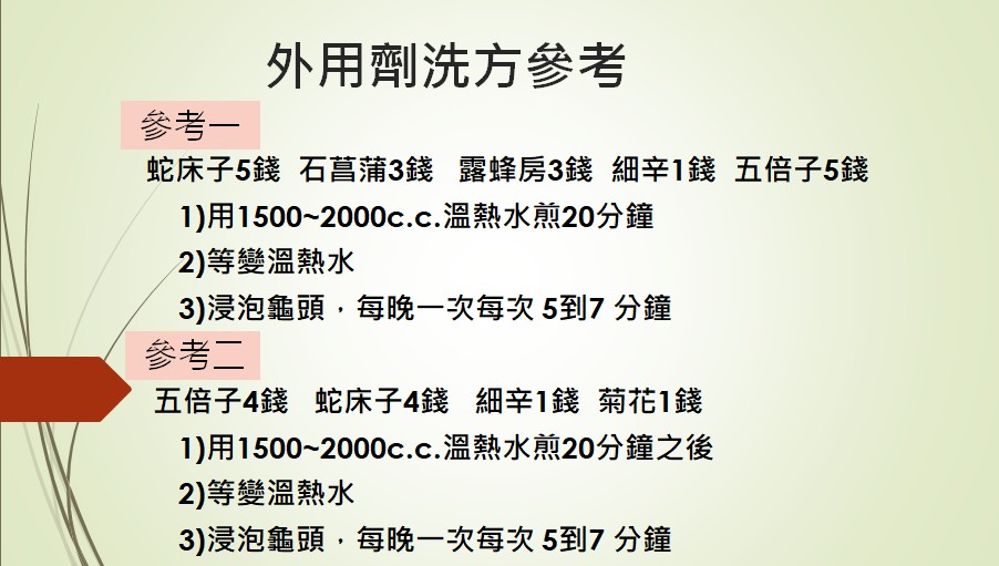 蛇床子5錢、石菖蒲3錢、露蜂房3錢、細辛1錢、五倍子5錢