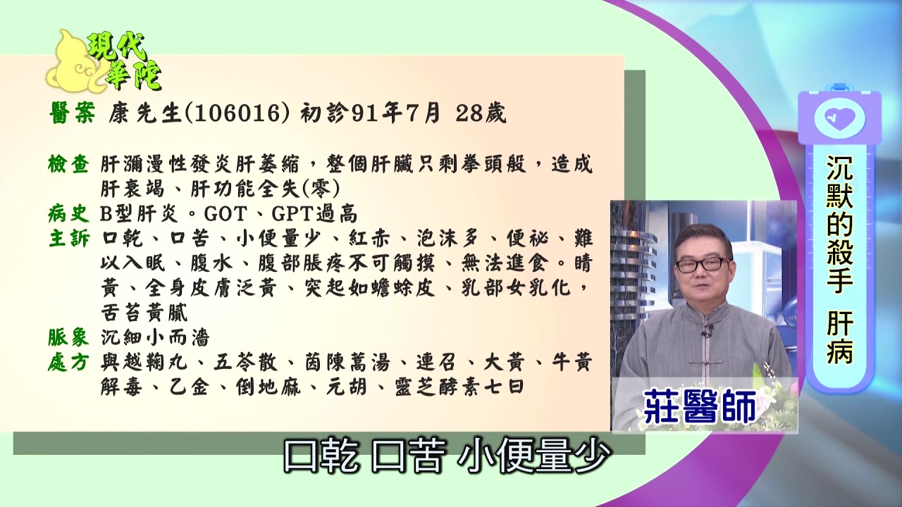 姓名 莊先生 編碼 1912006 初診 108年12月,58歲 檢查 B型肝炎、肝硬化、肺癌 肝癌 3.5cm、4.5cm兩處。 血清檢測GOT 51、GPT 69,ALP 113、rGT 280、AFP 49.56 主訴 肝癌已轉移肺部,時咳,求診時,已服用降糖劑、降壓劑多年、尿酸間續服用。 脈象 沈緩微濇 舌苔 黃膩 處方 食前紫根牡蠣湯,桂枝茯苓湯、牛黃解毒散、浙貝、刺五加、射干、川七、蒲公英、珍珠、綿茵陳,南星、五味子、甜菊;食後與牛黃解毒丸各一個月。 療程 一個月後回診GOT 48、GPT42、AFP 50,因膚癢,上藥加十六味,流氣飲、白鮮皮。 治療四個月後,追蹤斷層掃描檢查,瘤體由8 cm降為6 cm。 持續治療至第八個月 GOT 31、GPT 28 ,AFP 11.99、T.B 1.07。 莊先生於109年10月回診,據口述檢查肝、肺腫瘤已消失,肝腎血液檢查都已恢復標準值。因時咳,皮膚癢,持續治療觀察中。 血清檢測數值變化表 日期 GOP GPT GFR AFP 12/04 51 69 100 01/16 48 42 50 02/17 38 51 104 05/21 37 31 47.9 07/24 42 36 66.2 09/01 30 26 98.4 29.2 10/02 31 28 121 11.99 中醫藥利用現代生物科技做精準醫療 目前中醫藥利用現代生物科技,藥物可做特定元素萃取,作精準醫療,並微分化、酵素化易於吸收,藥效可直接作用於病原點,確立用藥後,可以快速又明顯的改善以期達到痊癒的目的。 本院設有民眾就診的權益保障,可參閱網站內一般門診與特約門診的權益保障內容。了解更多 有任何疑問嗎?我們非常樂意提供協助! 全省免付費電話:0800012169,電話諮詢時間 09:00-21:00(全年無休) 非門診時間,歡迎透過諮詢表單留下您的聯繫資訊,門診時間將會有專人盡快與您聯繫,謝謝您。 相關資訊: 醫生簡介與看診須知:https://www.xingchang.com.tw/doctor-introduction 三大權益保障:https://www.xingchang.com.tw/guarantee 門診時間:https://www.xingchang.com.tw/outpatients-time-and-transport 全面採『預約掛號』制,請先電話預約。